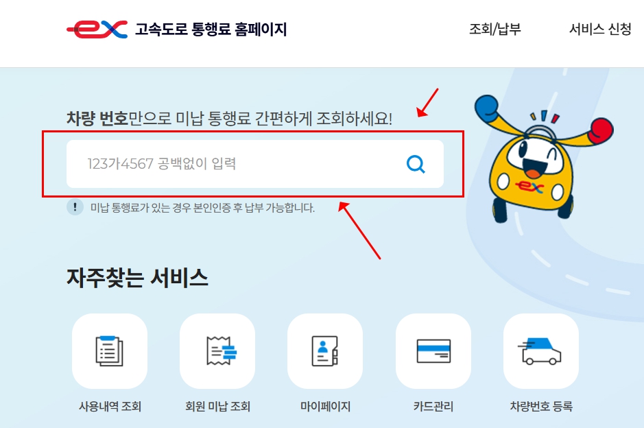 차량번호만 있으면 미납요금을 간편하게 조회할 수 있습니다. 단, 당일 미납내역은 다음날부터 조회 가능합니다.