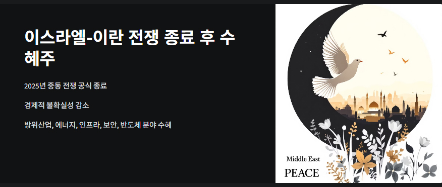 2025년, 중동을 뒤흔든 이스라엘과 이란 간 전쟁이 공식 종료되었습니다. 전 세계적으로 긴장이 완화되며 경제적 불확실성이 줄어들었고, 이에 따라 특정 산업군과 기업들은 직·간접적인 수혜를 입을 전망입니다.
